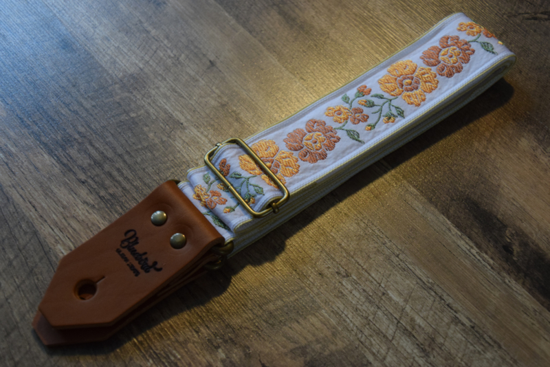 The Sun Floral strap brings warmth and nature-inspired elegance to your guitar. Its soft off-white background provides a gentle canvas for stylized six-petaled flowers woven in luminous gold and yellow-orange threads, accented with rust and terracotta tones for depth.