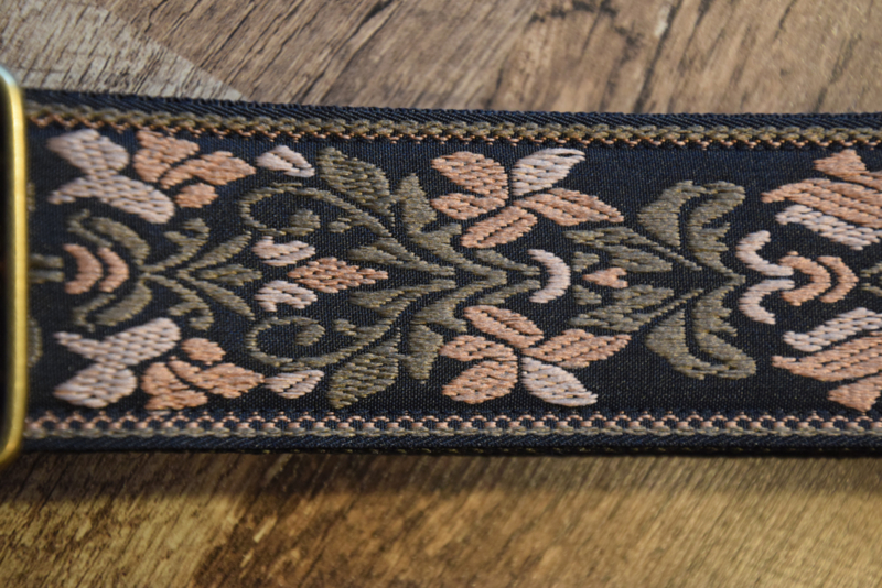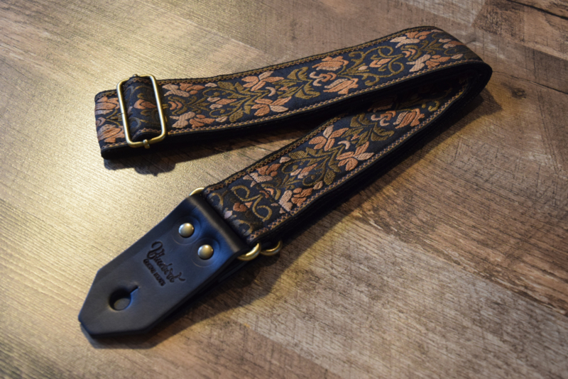 The Copper Brass Bloom vintage jacquard carries a bold floral motif in striking Copper, bronze, and soft beige on a deep black background. The fiery Copper blooms give the design a dramatic stage presence, balanced by earthy tones that make it versatile for any guitar. Finished with genuine black leather ends, antique brass hardware, and minimal stitching to preserve the original woven pattern, this strap embodies both durability and timeless style. A true vintage find, crafted to be the perfect match for your instrument.