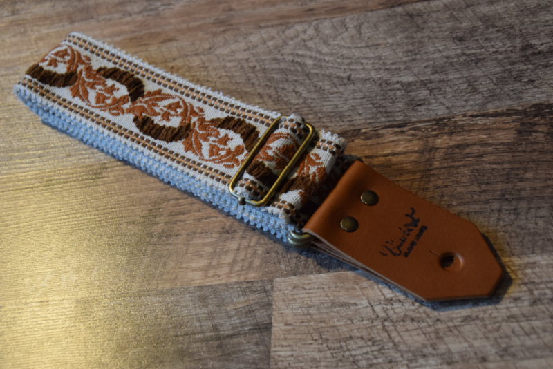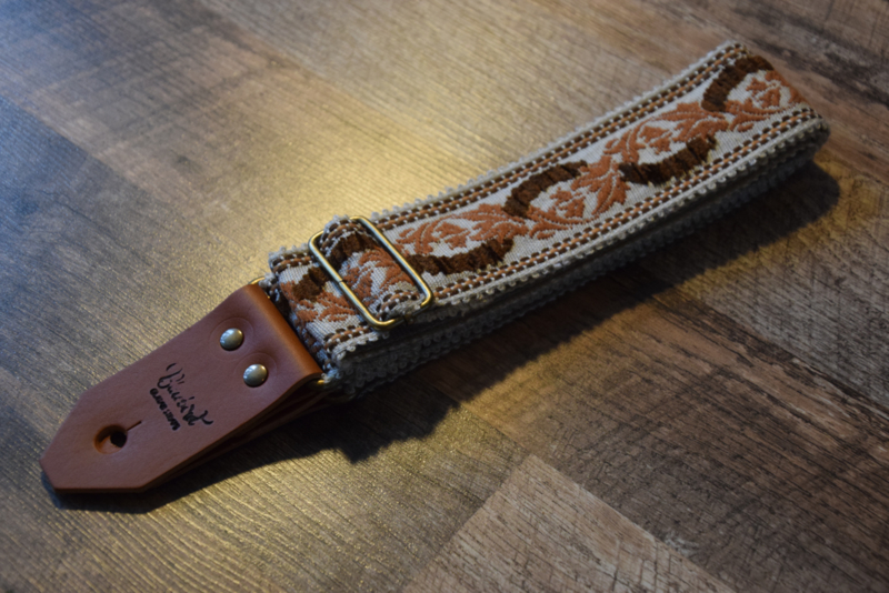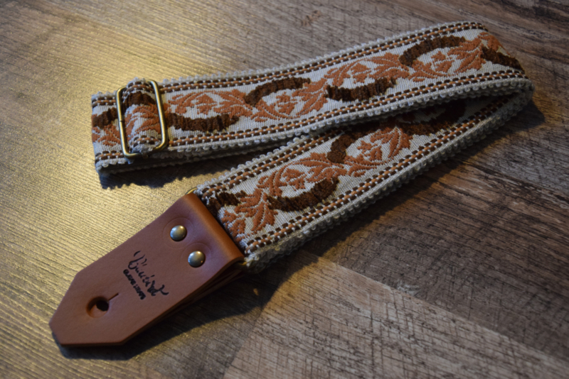 Woven from an original UK jacquard dating back to 1961, this strap features a creamy off-white base layered with copper-toned vine and leaf scrollwork running across the full length.