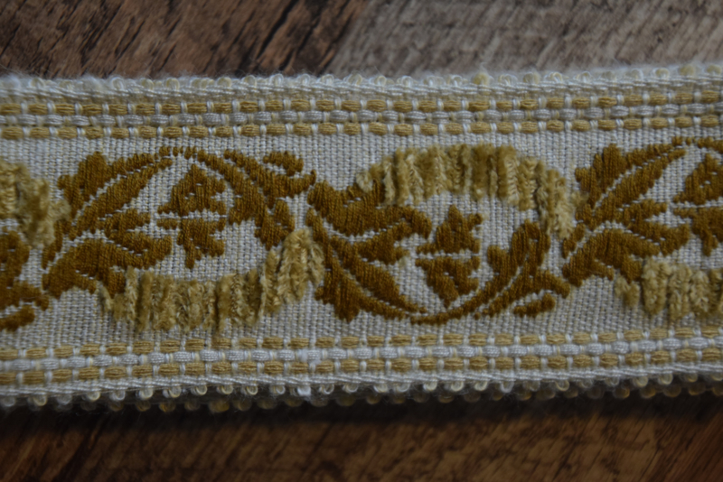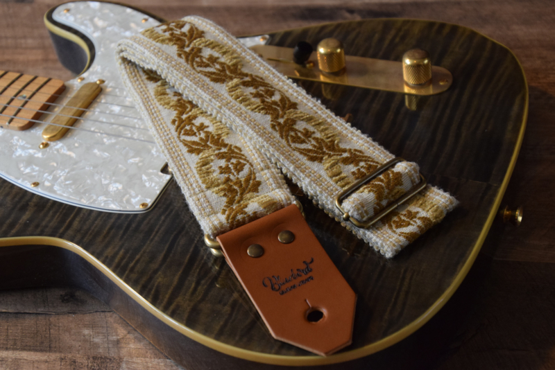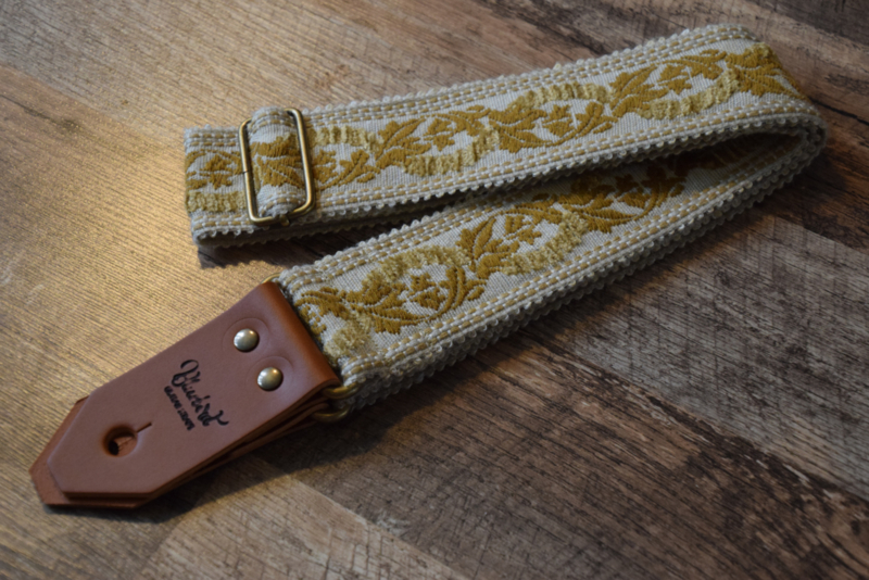 Woven from an original UK jacquard dating back to 1961, this strap features a creamy off-white base threaded with antique gold and mustard yellow floral scrollwork. Continuous vines and leaves form a repeating wave-like structure, with raised crescent-shaped elements nestled in the curves to create a pronounced, textured surface.