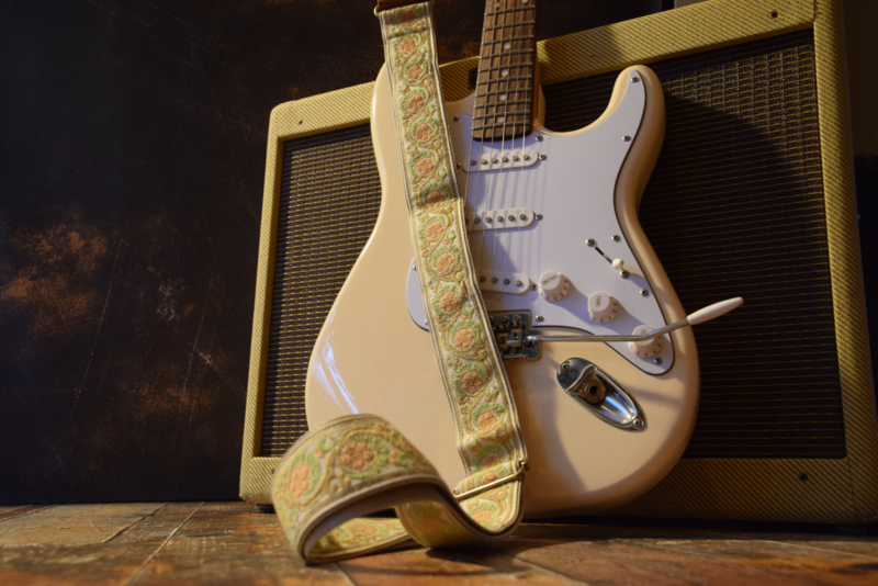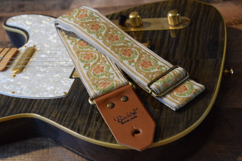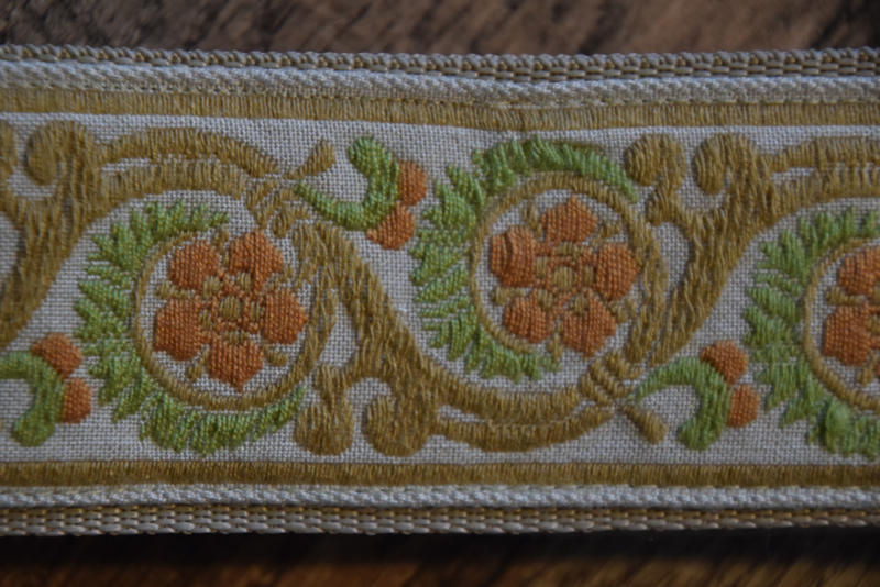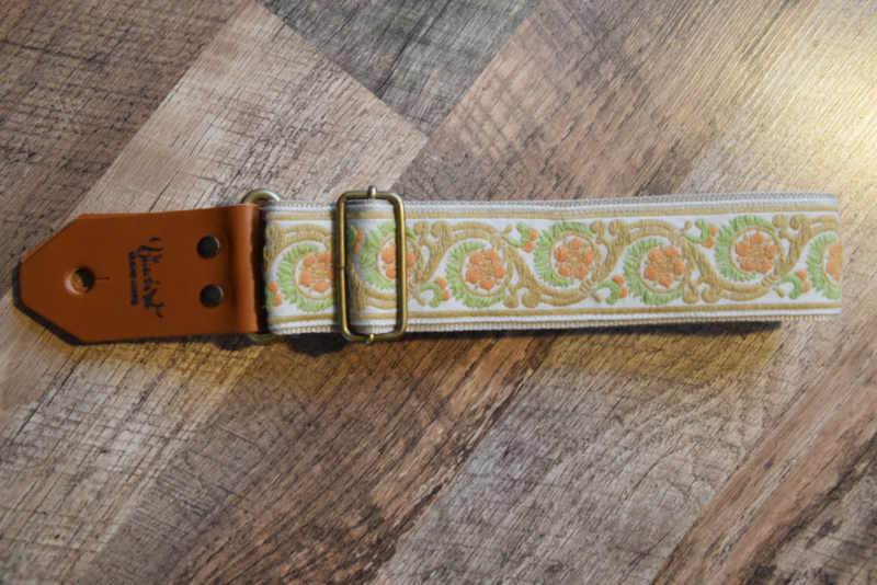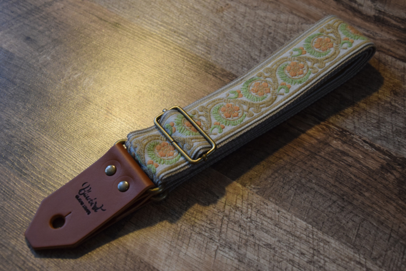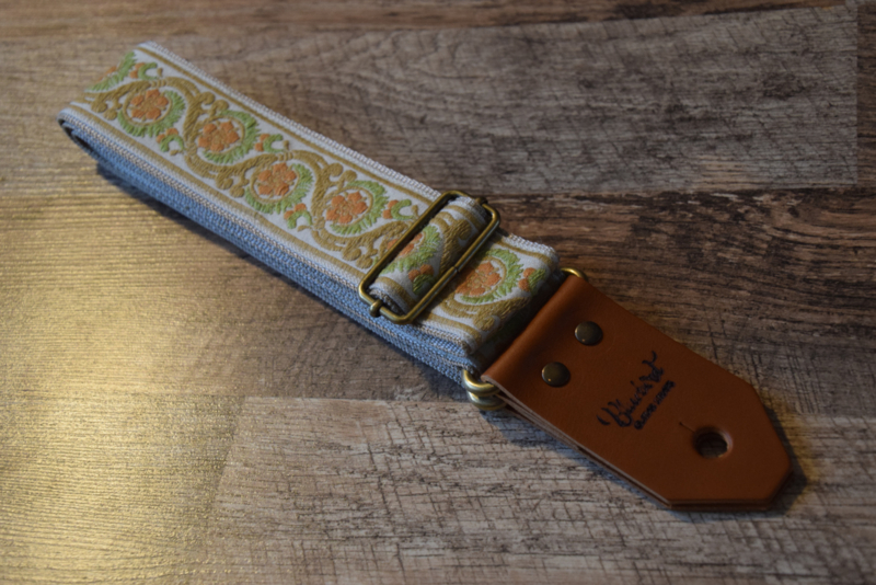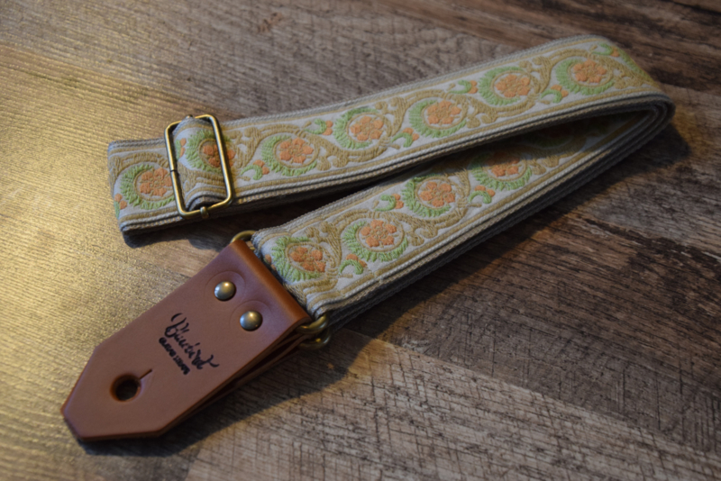 The jacquard ribbon is finished with double golden stitched borders, combining a solid line with small decorative dots along the top and bottom edges. Completed with cognac leather end-pieces and antique brass hardware, this strap preserves the charm and detail of the original fabric.