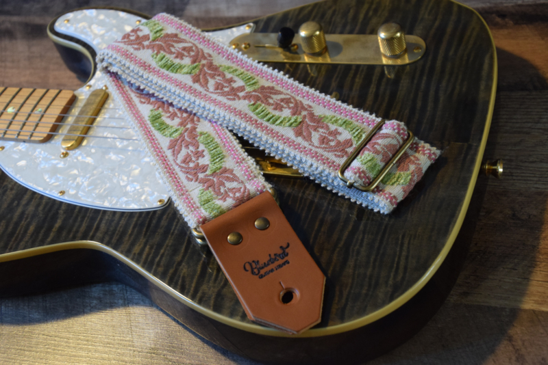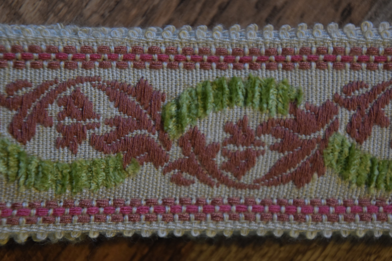 The jacquard showcases an elegant acanthus leaf and vine scroll flowing in a rhythmic horizontal repeat. Framed by picot edges and textured running stitches, the strap contrasts a flat-woven ground with plush dimensional chenille. Finished with cognac leather ends and aged brass hardware, it delivers vintage charm, rich texture.