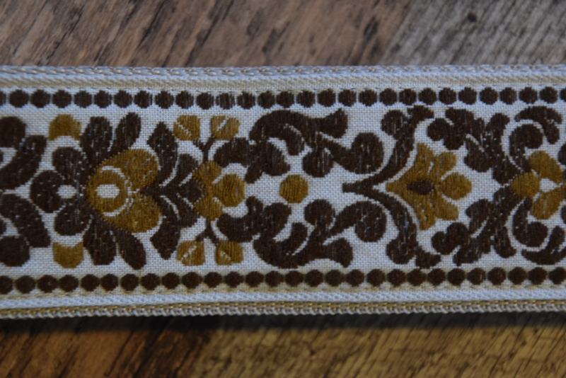 The jacquard displays a symmetrical Baroque-inspired floral and scroll pattern in a consistent horizontal repeat. Raised dark brown and caramel elements create a plush velvet-like texture against the flat-woven background. Finished with cognac leather ends and aged brass hardware, this strap combines vintage sophistication, rich texture.