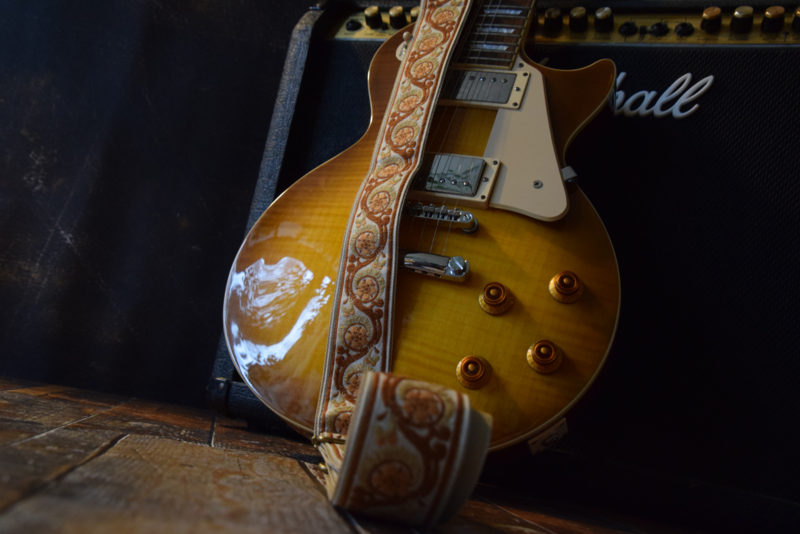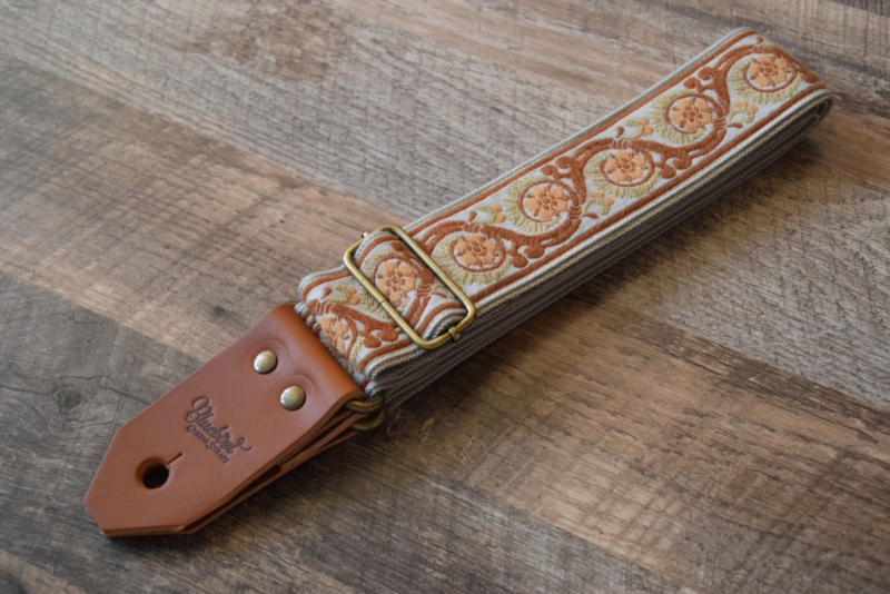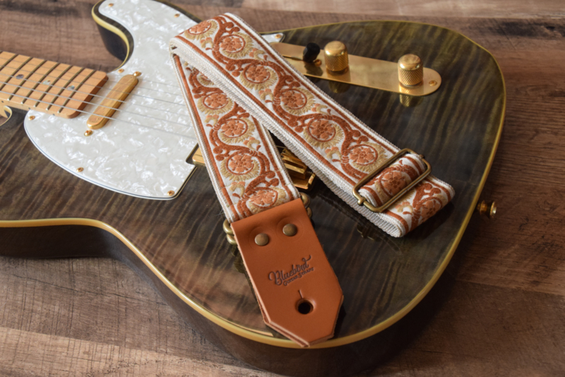 The UK Ocher Vine Bloom strap is woven on a neutral oatmeal base, carrying rich ocher and soft harvest gold floral scrolls with muted peach accents woven into the rosette centers.