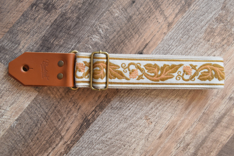 The jacquard displays an elegant acanthus leaf and vine motif flowing in a continuous horizontal repeat, interspersed with delicate botanical clusters. A solid ochre linear border frames the design, while raised plush chenille elements contrast against the flat-woven background. Finished with cognac leather ends and aged brass hardware, this strap delivers refined vintage character and classic Bluebird craftsmanship.