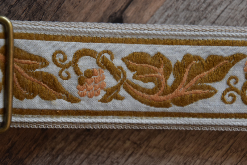 The UK Ocher Berry Vine strap is woven on a neutral beige base, featuring golden ochre and muted tan vine scrolls with soft apricot floral accents adding warmth and subtle contrast.