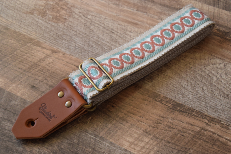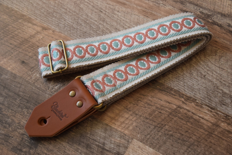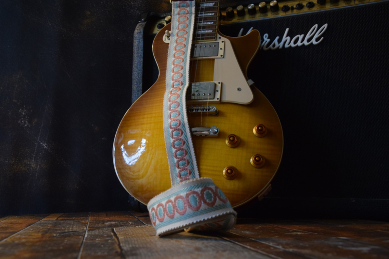 This vintage jacquard from 1971 UK features a light beige woven base paired with soft coral pink and fresh aqua mint tones. The repeating circle-and-bar motif creates a clean geometric flow, framed by delicate diagonal borders and a subtle picot-style edge. The cotton jacquard shows a balanced mix of texture and structure, giving the pattern clarity while keeping the surface smooth and consistent. A bright yet gentle color combination that feels playful, graphic, and unmistakably vintage.