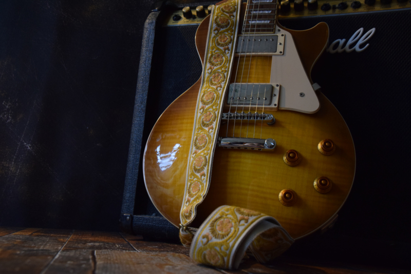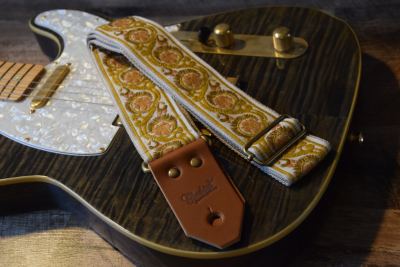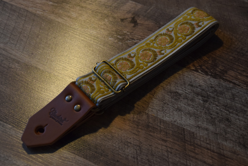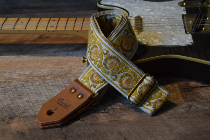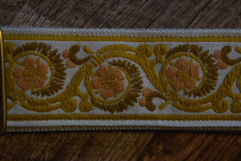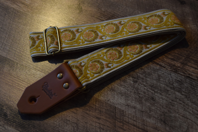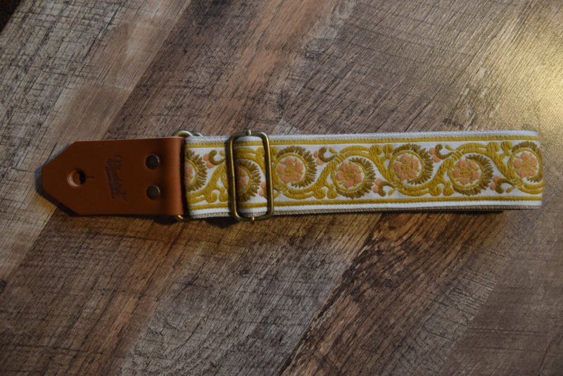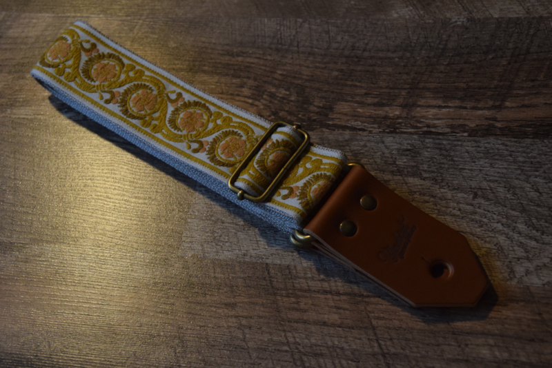 The jacquard features ornate, swirling vine motifs where stylized rosettes are cradled by curved acanthus leaves in a continuous horizontal repeat. A solid Ocher stripe forms a bold linear border, while raised plush chenille elements contrast against the flat-woven background. Finished with cognac leather ends and aged brass hardware, this strap reflects classic Bluebird character and refined vintage detail.