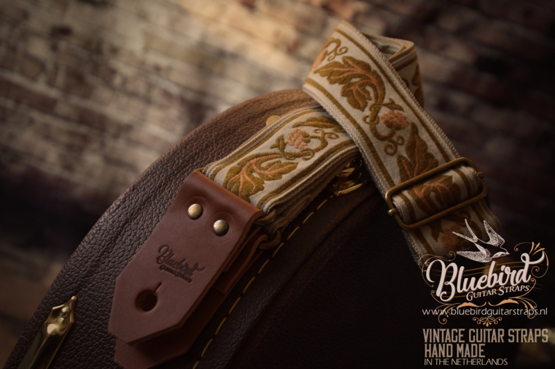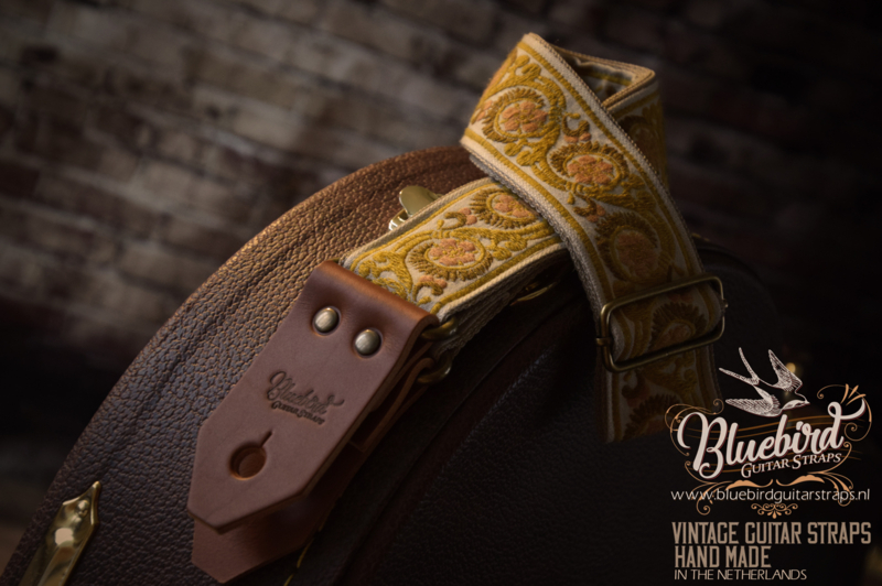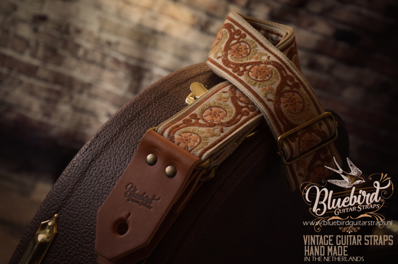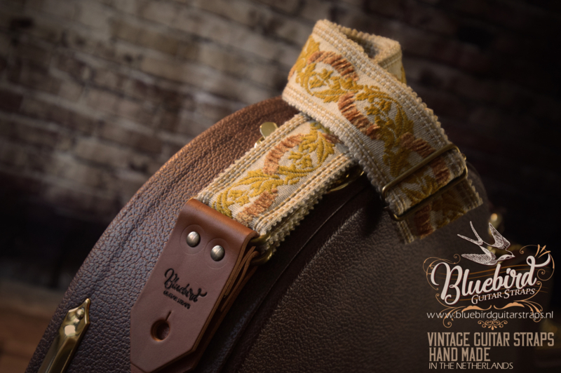 Bluebird Vintage Series - Ocher Flourishes Scroll1965 Antwerp cotton jacquard in ocher on beige, minimal stitching to preserve the original pattern, finished with genuine leather ends and aged brass hardware. A rare unique find and collectible vintage Bluebird guitar strap.
