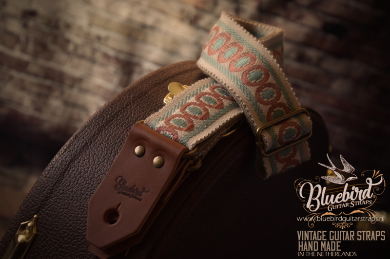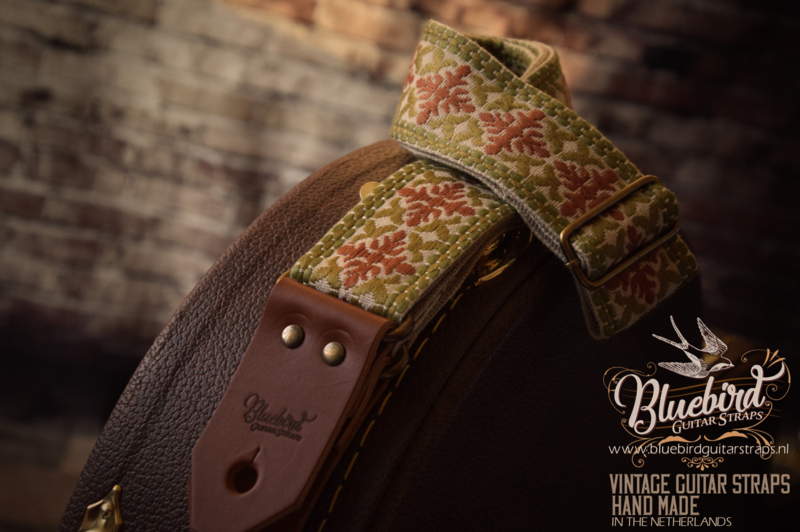 Bluebird Vintage Series - Vintage Green Spiral1975 Dutch jacquard with green spiral circles and yellow accents on beige. Geometric cotton weave with vintage charm, finished with genuine leather ends and aged brass hardware. A rare find and collectible vintage Bluebird guitar