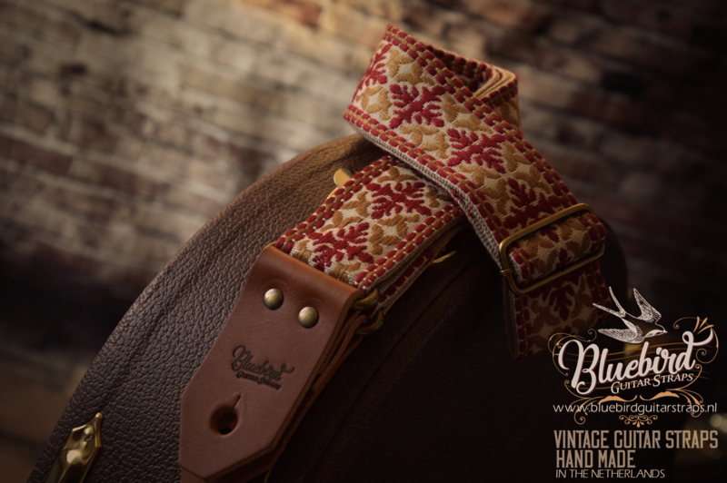 Bluebird Vintage Series - Maple Leafs1970 Brussels cotton jacquard in orange and dark red on beige, maple leaf motif between twin edge lines, minimal stitching, leather ends, and aged brass hardware. A rare vintage find and collectible vintage Bluebird guitar strap.