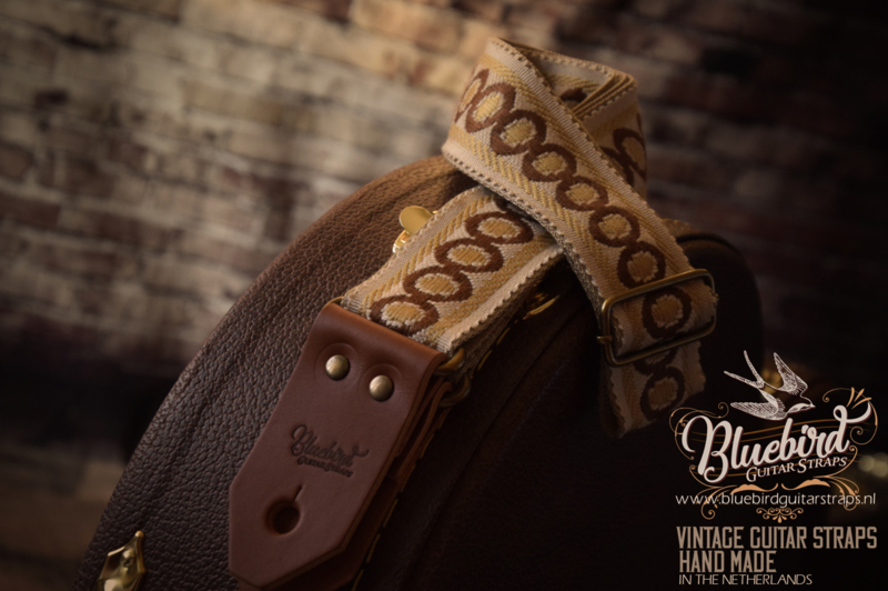 Bluebird Vintage Series - Antwerp Brown vs BeigeA unique 1965 Antwerp cotton-wool jacquard in chocolate brown & beige, with a subtle spiral motif woven through. Finished with genuine leather ends & aged brass hardware. A rare find and collectible vintage Bluebird guitar strap.