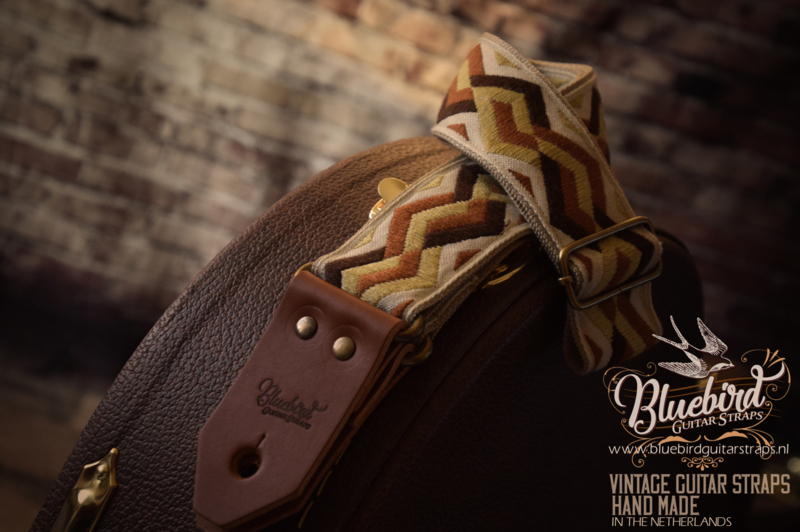 Bluebird Vintage Series - Vintage Ocher Beigea rare 1970 French jacquard in warm ocher and beige with a vertical textured pattern, bordered with blocky brown detailing. Genuine leather ends and aged brass hardware. A rare find and collectible vintage Bluebird guitar strap.